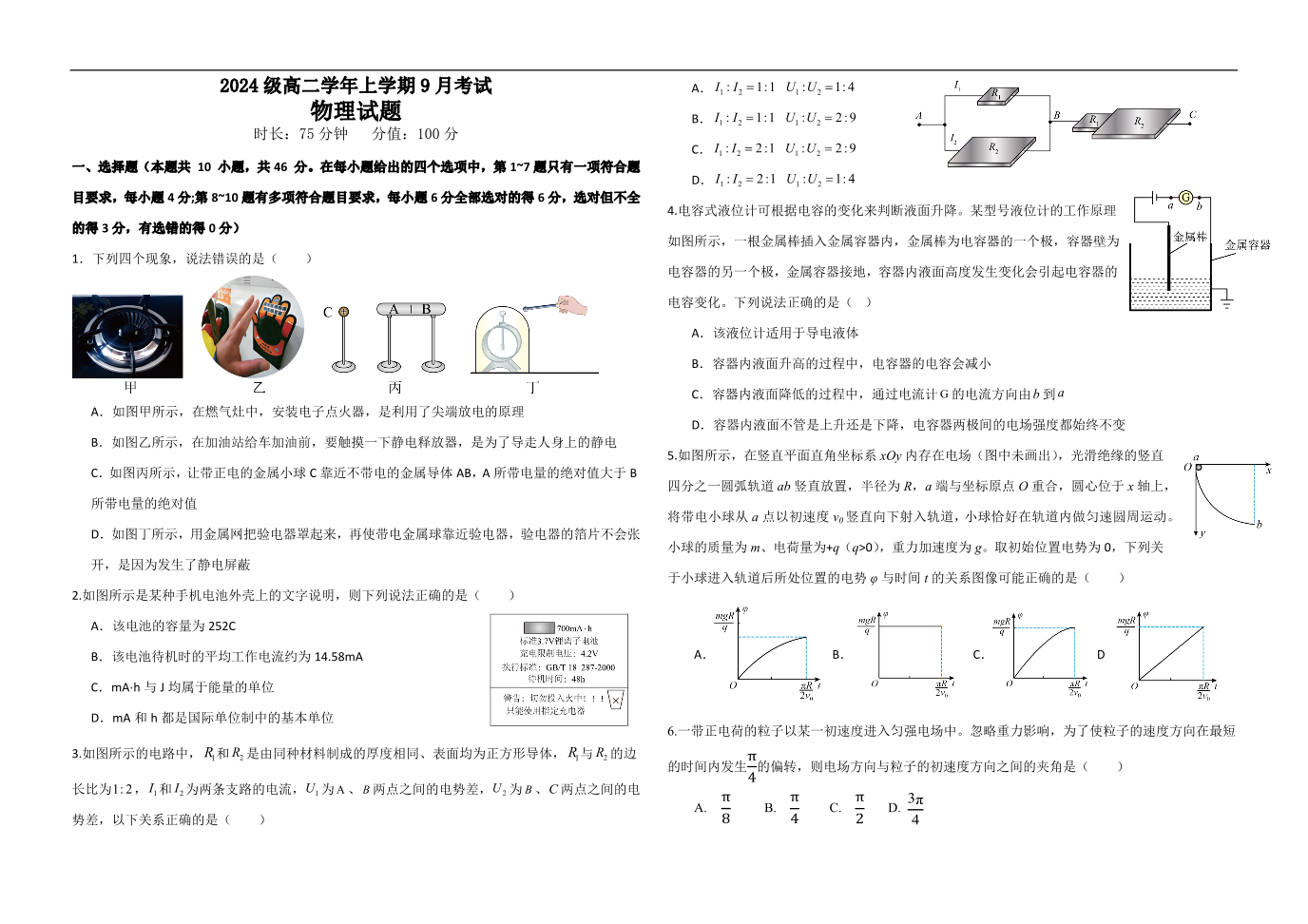 高二物理(致远班)--黑龙江省牡丹江市第一高级中学2025-2026学年高二上学期9月月考