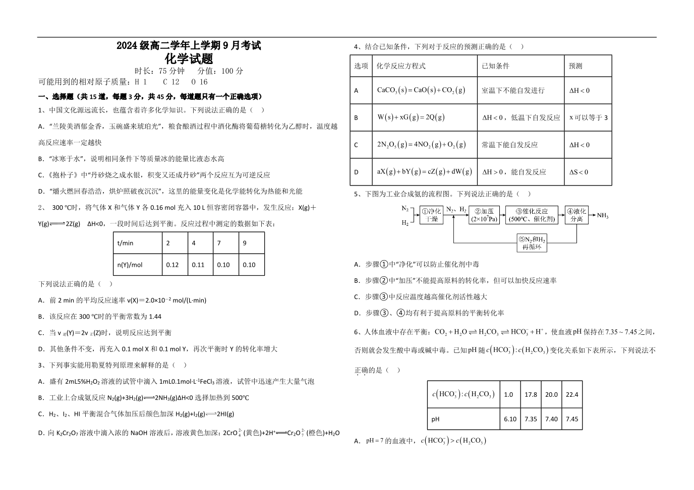 高二化学(平行班)--黑龙江省牡丹江市第一高级中学2025-2026学年高二上学期9月月考