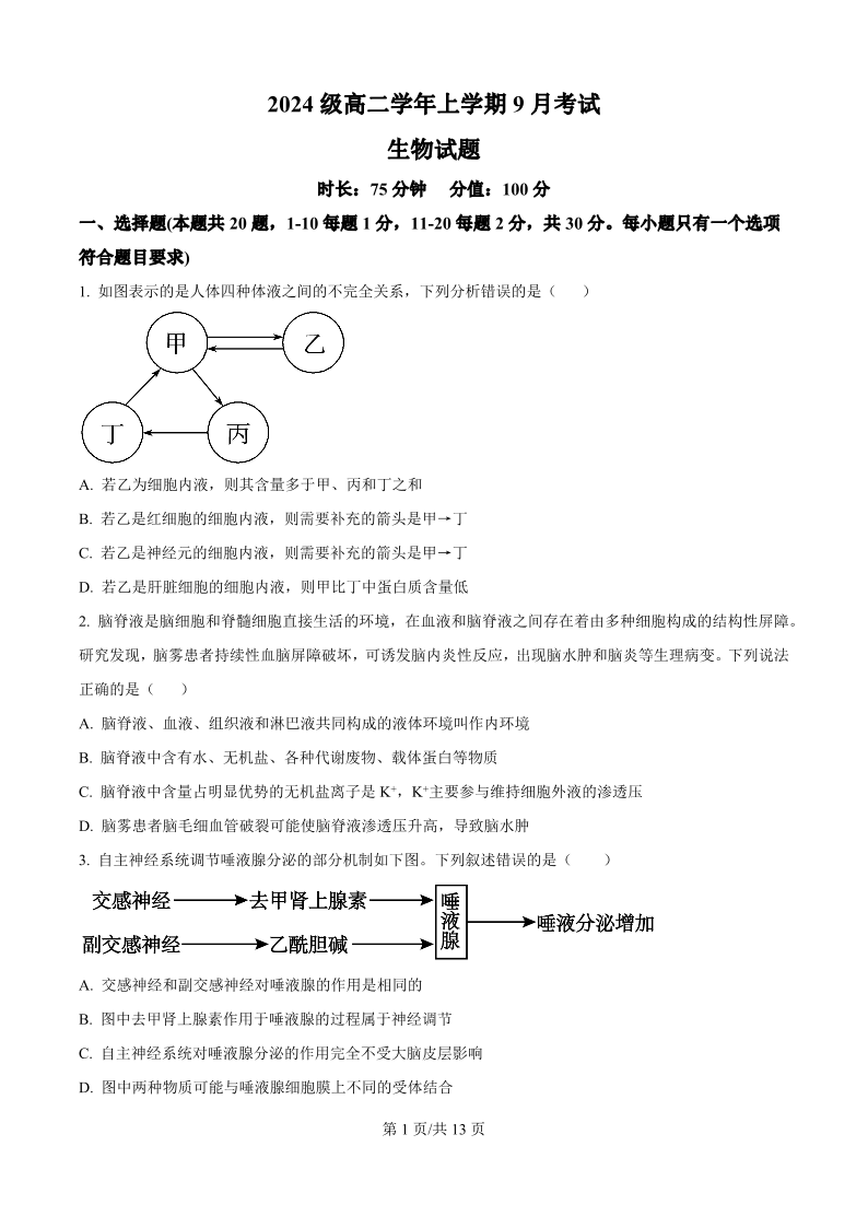 高二生物(致远班)(原卷版)--黑龙江省牡丹江市第一高级中学2025-2026学年高二上学期9月月考