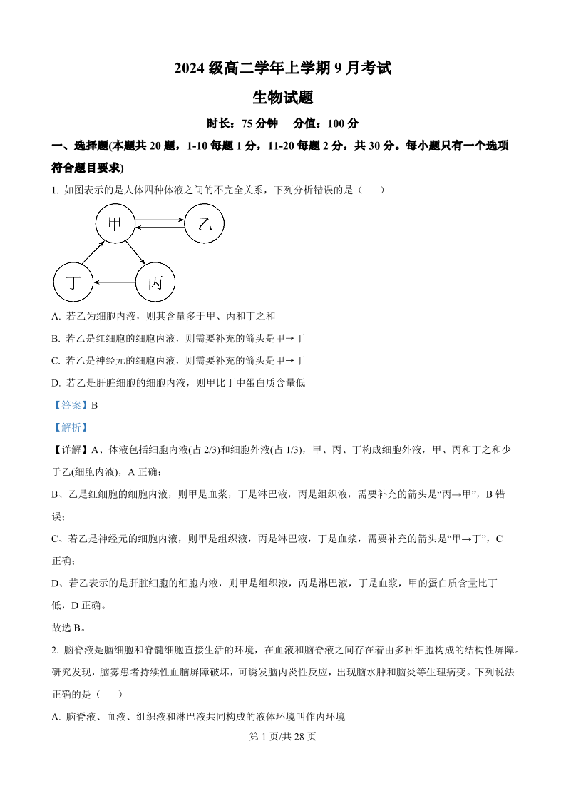 高二生物(致远班)(精品解析版)--黑龙江省牡丹江市第一高级中学2025-2026学年高二上学期9月月考