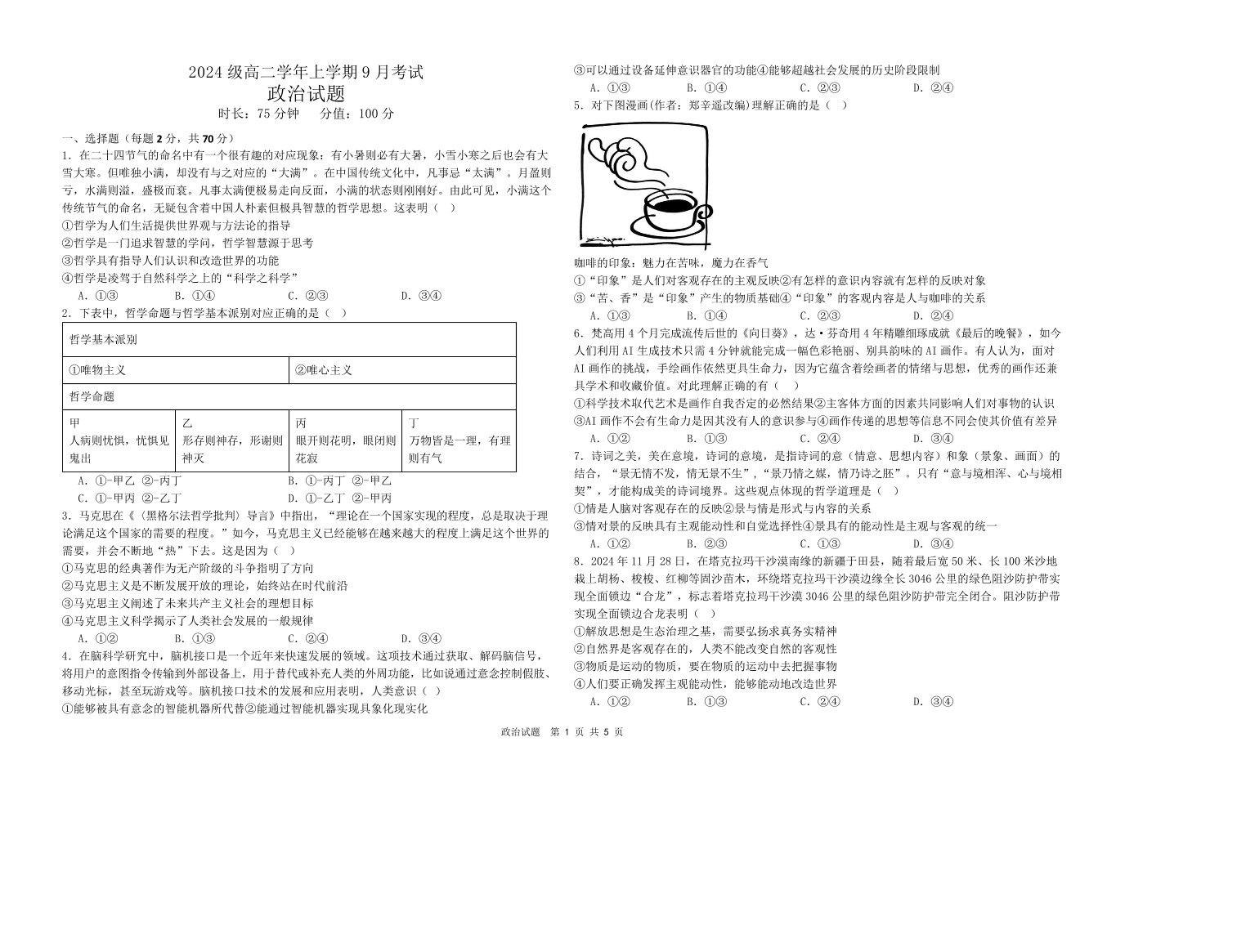 高二政治(致远班)--黑龙江省牡丹江市第一高级中学2025-2026学年高二上学期9月月考