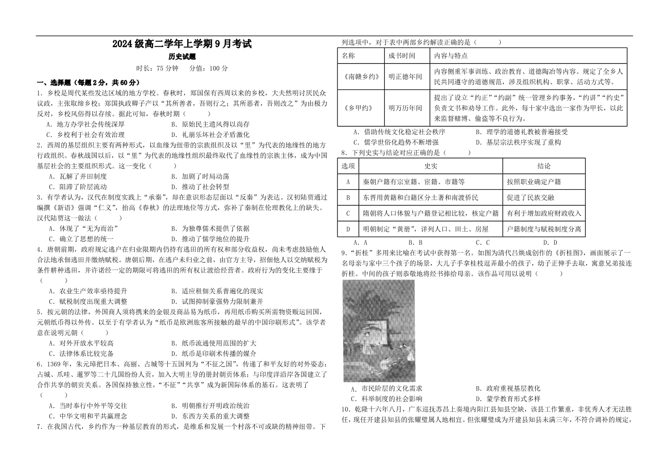 高二历史(平行班)--黑龙江省牡丹江市第一高级中学2025-2026学年高二上学期9月月考