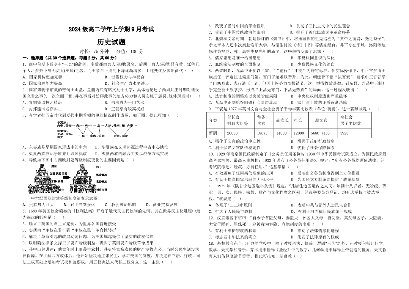 高二历史(致远班)--黑龙江省牡丹江市第一高级中学2025-2026学年高二上学期9月月考