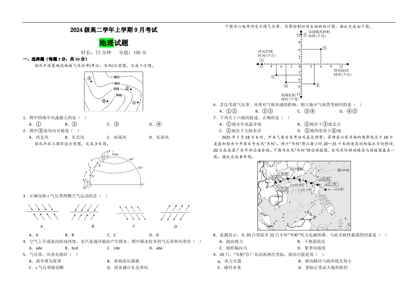 高二地理(平行班)--黑龙江省牡丹江市第一高级中学2025-2026学年高二上学期9月月考