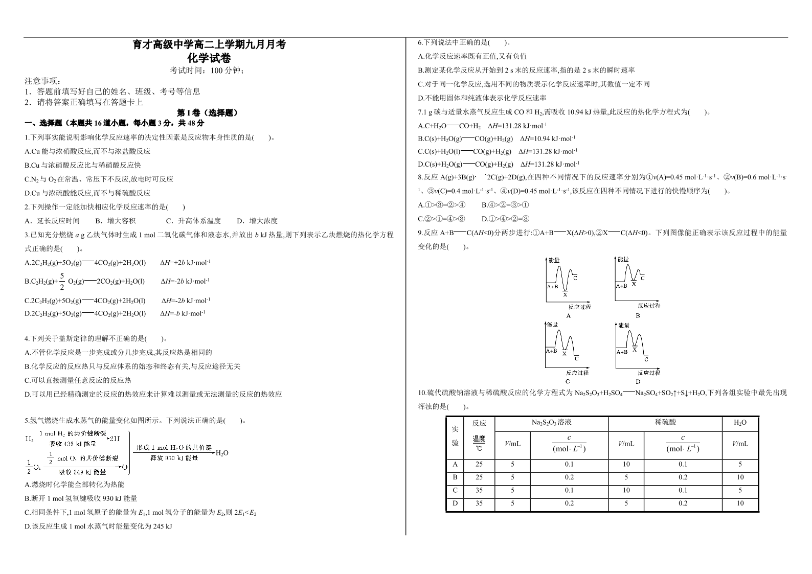 高二化学--湖北省黄冈市黄梅县育才高级中学2025-2026学年高二上学期9月月考