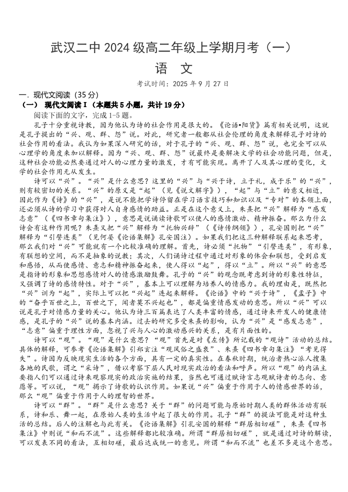 高二语文+答案--湖北省武汉市第二中学2025-2026学年高二上学期9月月考