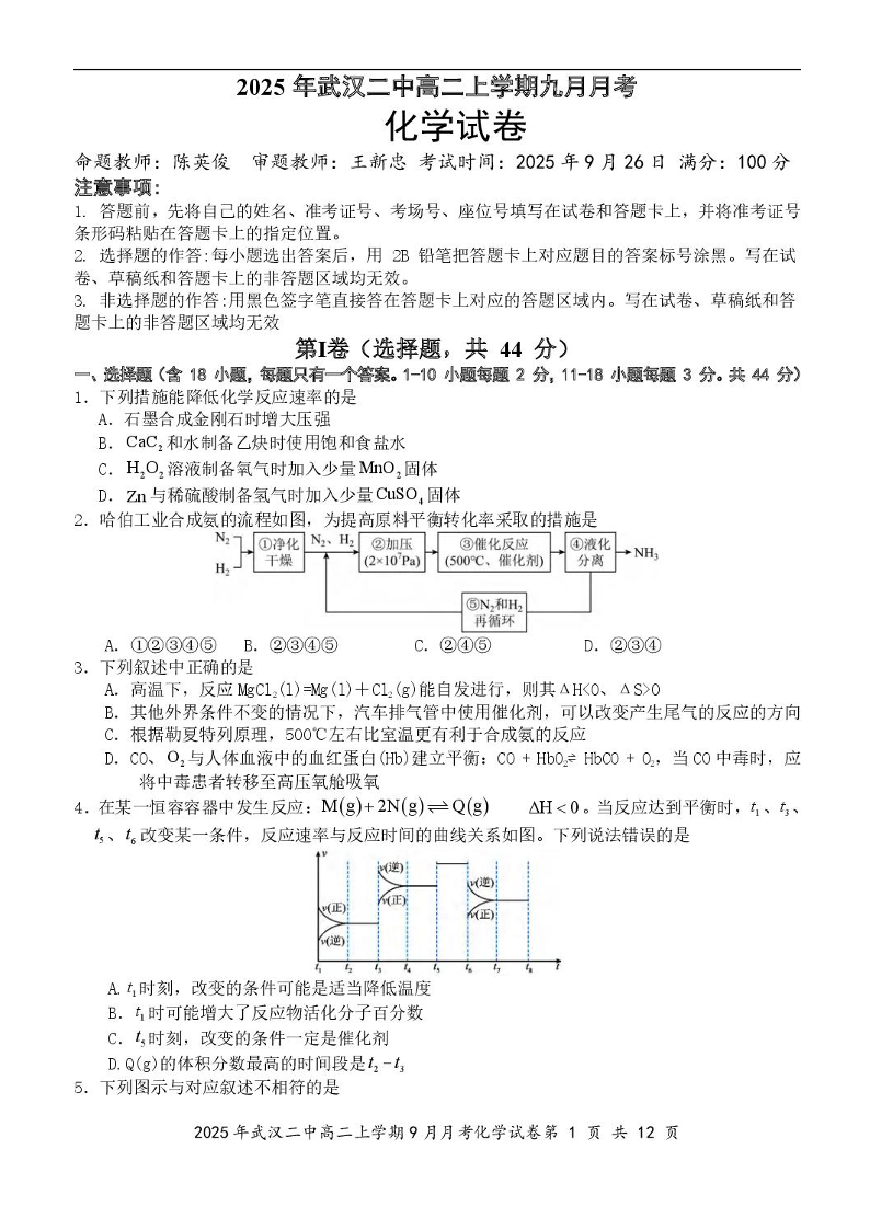 高二化学+答案--湖北省武汉市第二中学2025-2026学年高二上学期9月月考