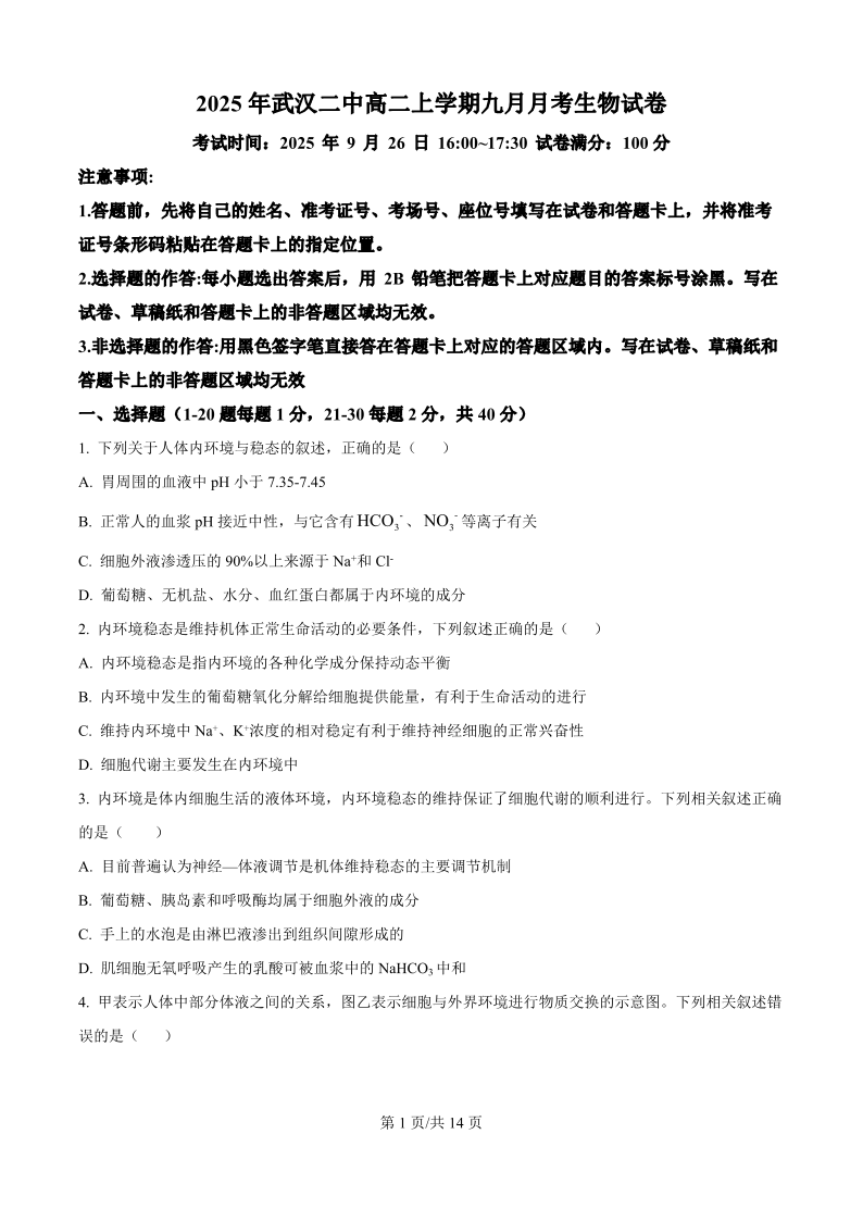 高二生物(原卷版)--湖北省武汉市第二中学2025-2026学年高二上学期9月月考