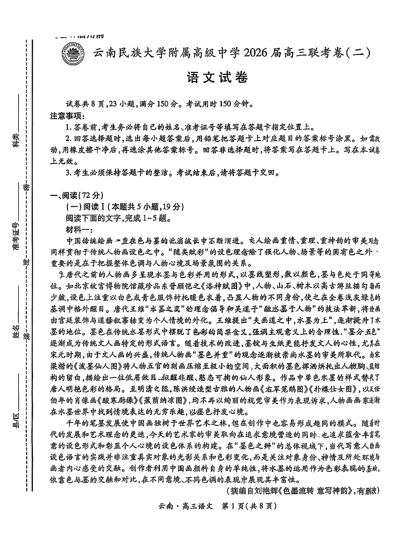 高三语文--云南民族大学附属高级中学2026届高三联考卷(二)