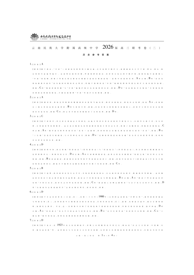 高三历史答案--云南民族大学附属高级中学2026届高三联考卷(二)