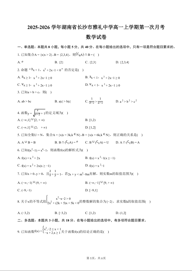 高一数学+答案--湖南省长沙市雅礼中学2025-2026学年高一上学期第一次(10月)质量检测