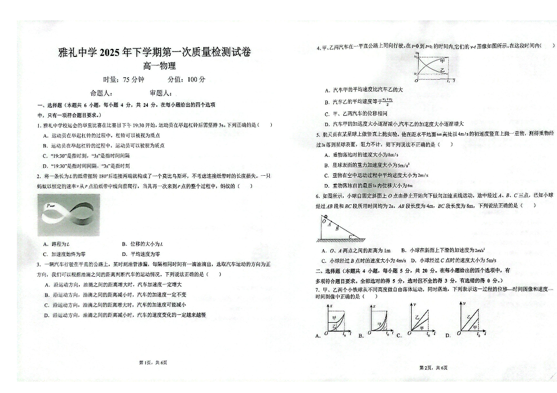 高一物理--湖南省长沙市雅礼中学2025-2026学年高一上学期第一次(10月)质量检测