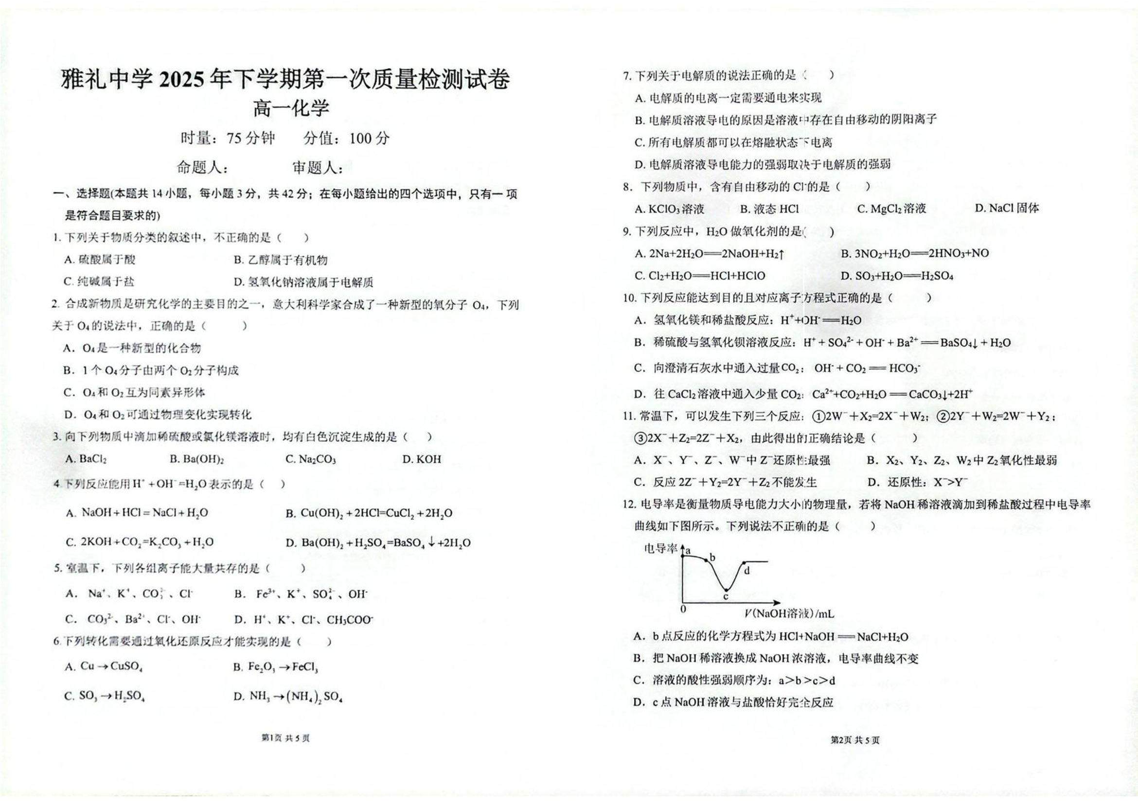 高一化学--湖南省长沙市雅礼中学2025-2026学年高一上学期第一次(10月)质量检测