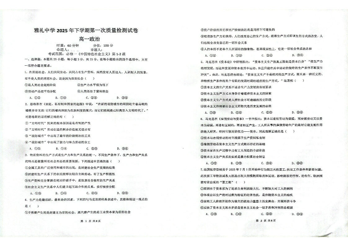 高一政治--湖南省长沙市雅礼中学2025-2026学年高一上学期第一次(10月)质量检测