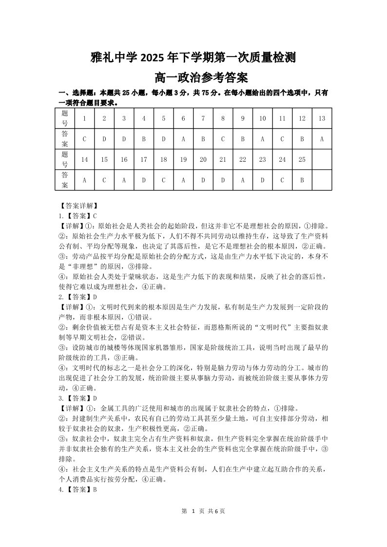 高一政治答案--湖南省长沙市雅礼中学2025-2026学年高一上学期第一次(10月)质量检测