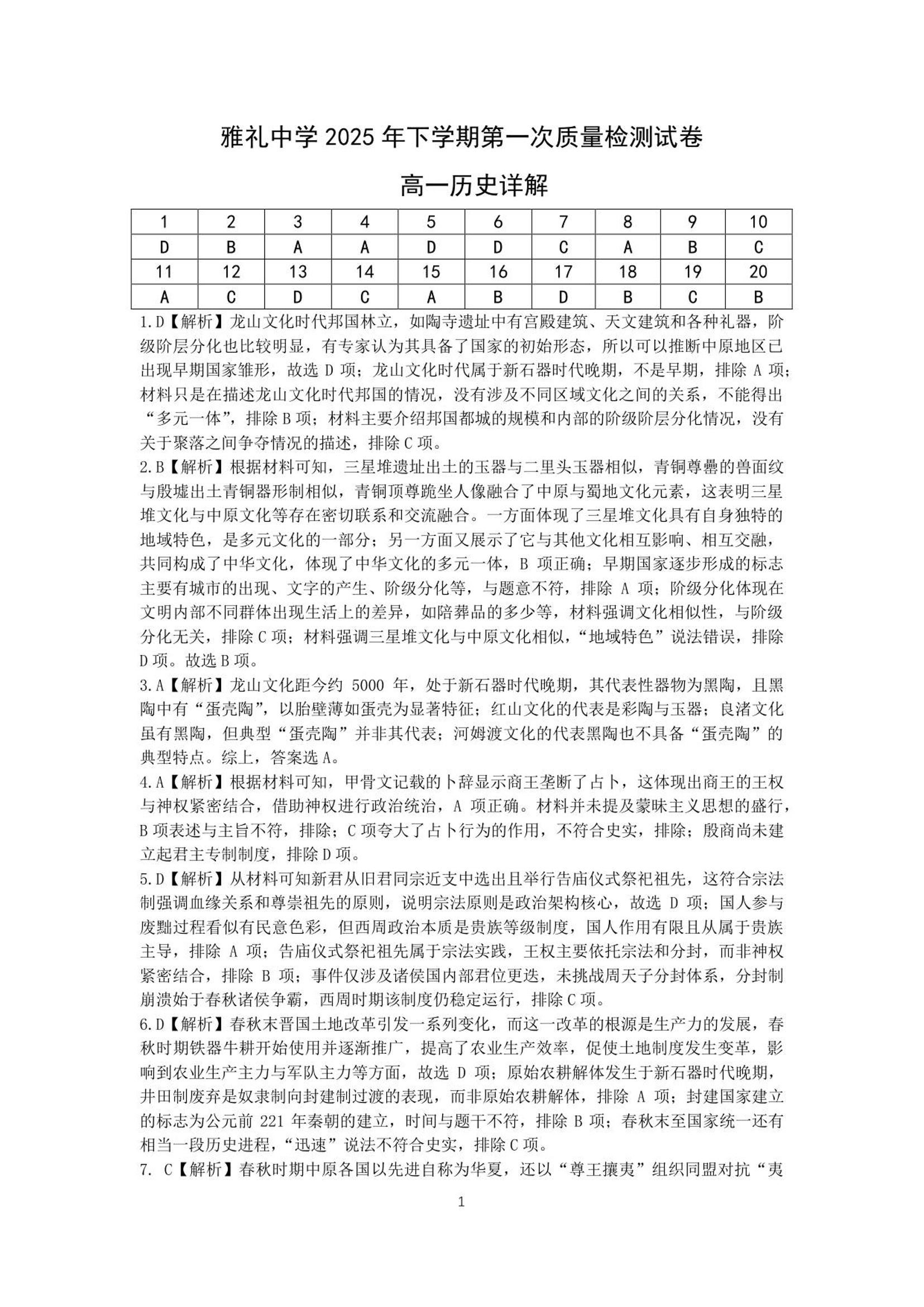 高一历史答案--湖南省长沙市雅礼中学2025-2026学年高一上学期第一次(10月)质量检测