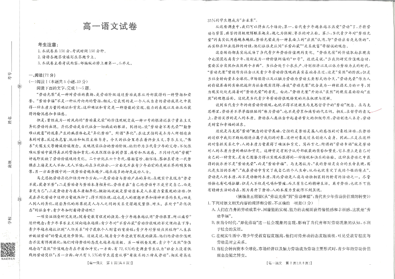 高一语文--江西省2025-2026学期高一上学期10月联考