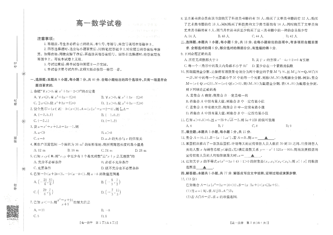 高一数学--江西省2025-2026学期高一上学期10月联考