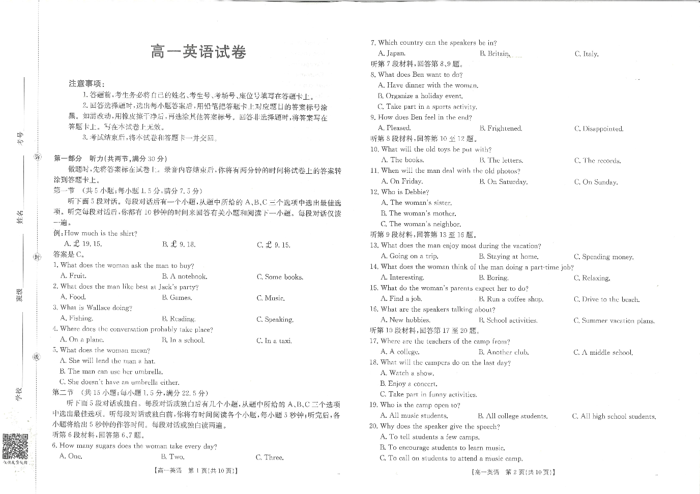 高一英语--江西省2025-2026学期高一上学期10月联考