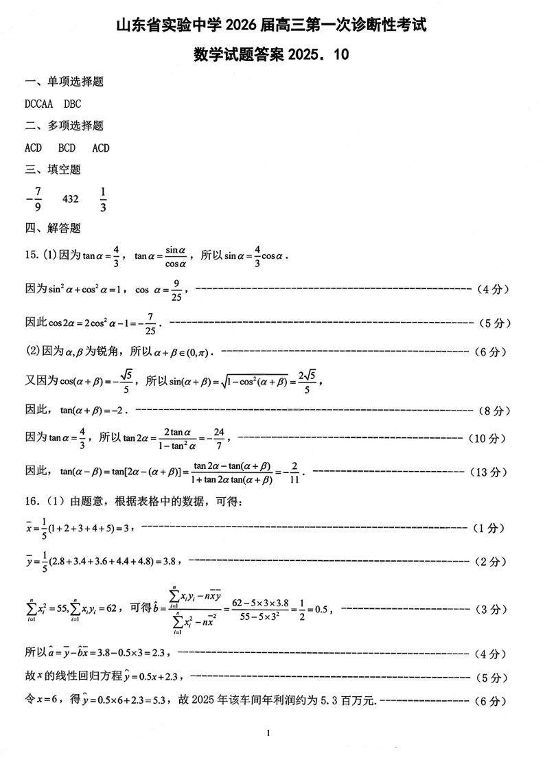 高三数学答案--山东省实验中学2026届高三第一次诊断考试