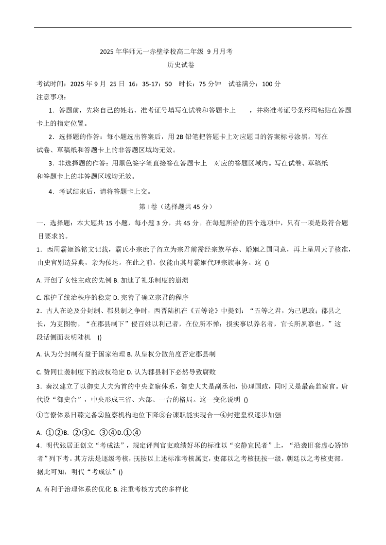 高二历史+答案--湖北省咸宁市华师元一赤壁学校2025-2026学年高二上学期9月月考