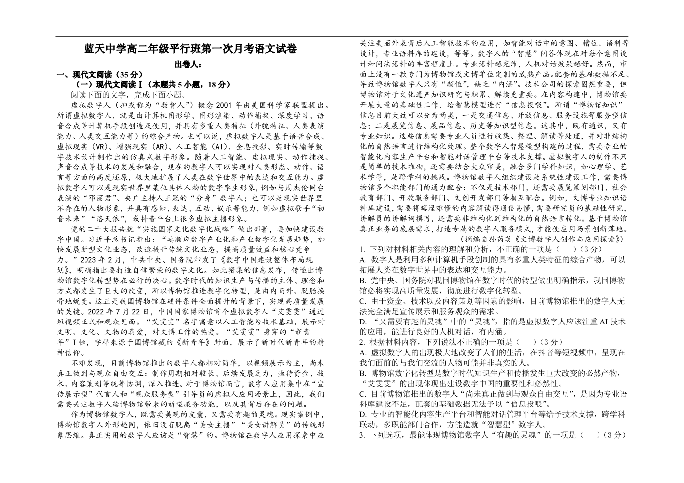 高二语文--江西省上饶市余干县私立蓝天中学2025-2026学年高二上学期第一次月考