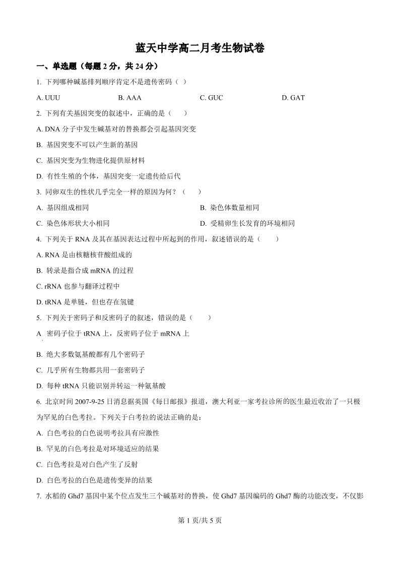 高二生物(原卷版)--江西省上饶市余干县私立蓝天中学2025-2026学年高二上学期第一次月考