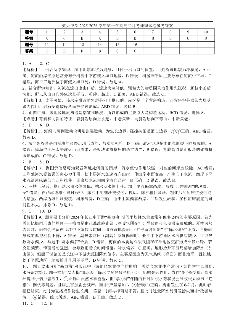 高二地理答案--江西省上饶市余干县私立蓝天中学2025-2026学年高二上学期第一次月考