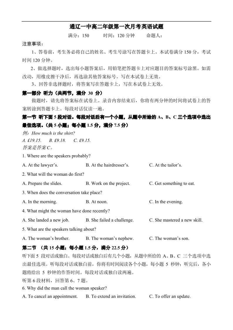 高二英语--内蒙古通辽市第一中学2025-2026学年高二上学期第一次月考