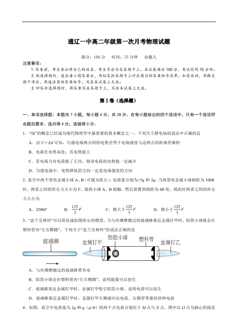 高二物理(普通班)--内蒙古通辽市第一中学2025-2026学年高二上学期第一次月考