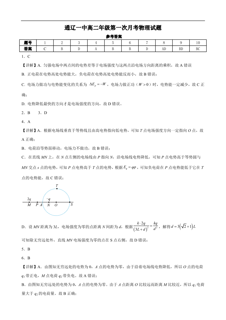高二物理(普通班)答案--内蒙古通辽市第一中学2025-2026学年高二上学期第一次月考