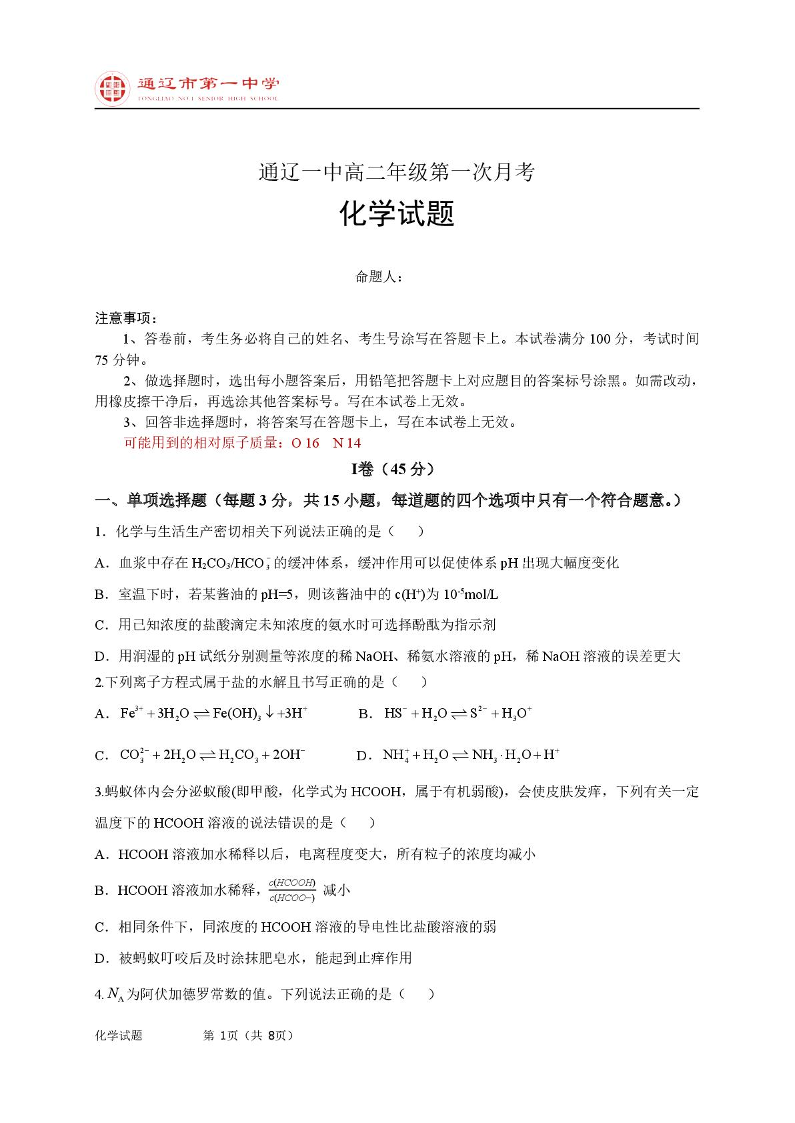 高二化学(普通班)--内蒙古通辽市第一中学2025-2026学年高二上学期第一次月考