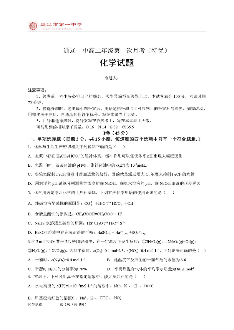 高二化学(特优班)--内蒙古通辽市第一中学2025-2026学年高二上学期第一次月考