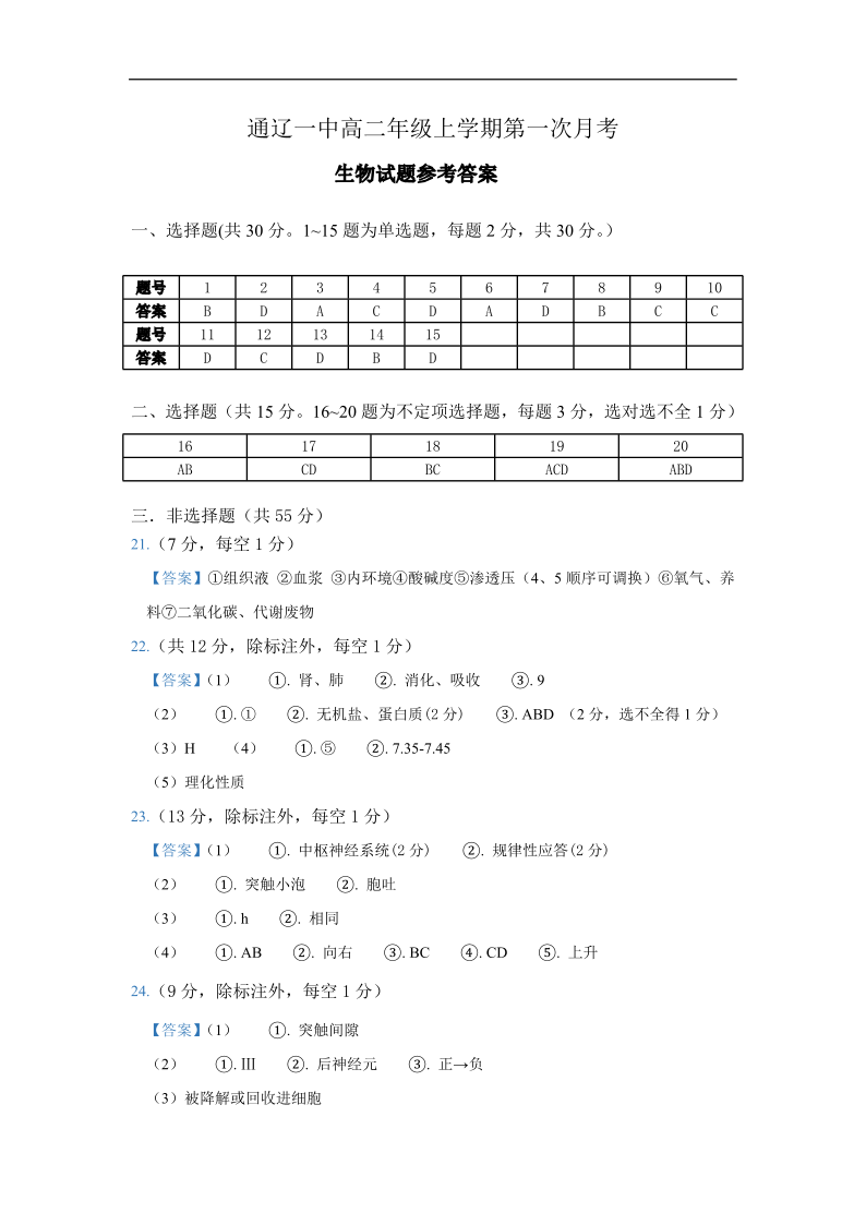 高二生物答案--内蒙古通辽市第一中学2025-2026学年高二上学期第一次月考