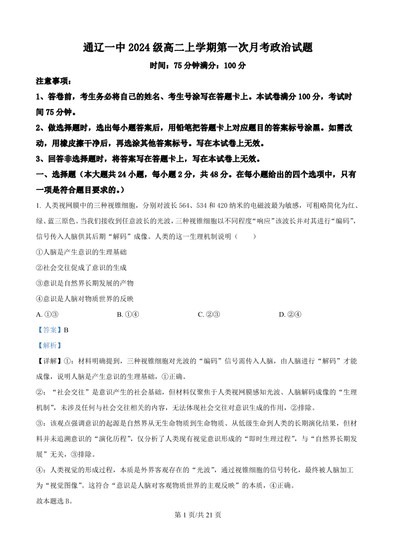 高二政治(精品解析版)--内蒙古通辽市第一中学2025-2026学年高二上学期第一次月考