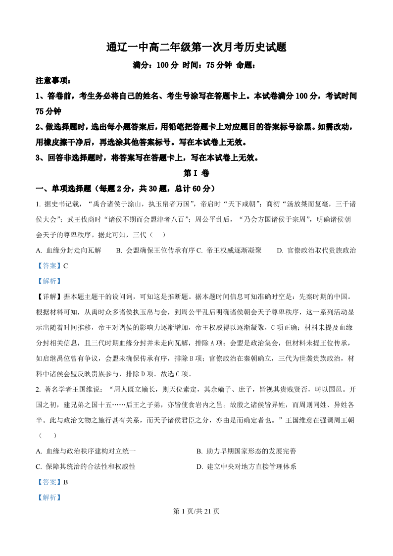 高二历史(精品解析版)--内蒙古通辽市第一中学2025-2026学年高二上学期第一次月考
