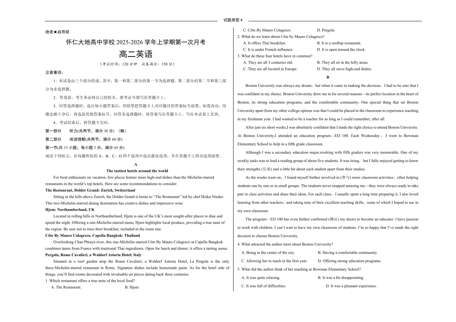 高二英语A卷--山西省朔州市怀仁市大地高中学校2025-2026学年高二上学期第一次月考