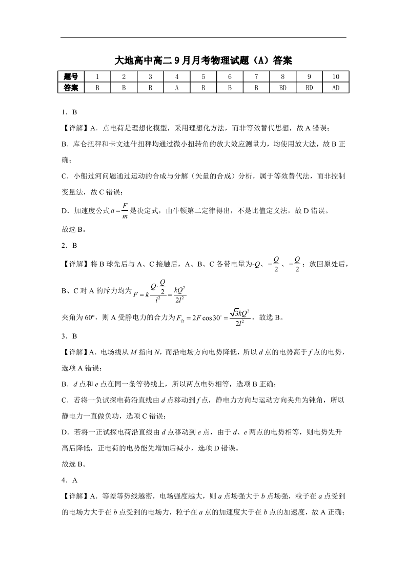 高二物理A卷答案--山西省朔州市怀仁市大地高中学校2025-2026学年高二上学期第一次月考