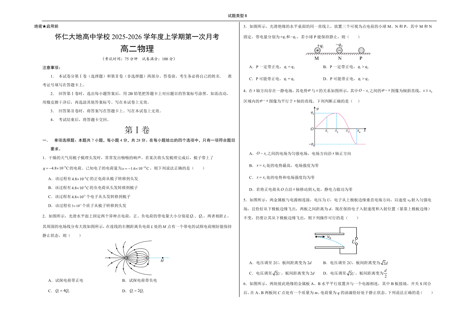 高二物理B卷--山西省朔州市怀仁市大地高中学校2025-2026学年高二上学期第一次月考