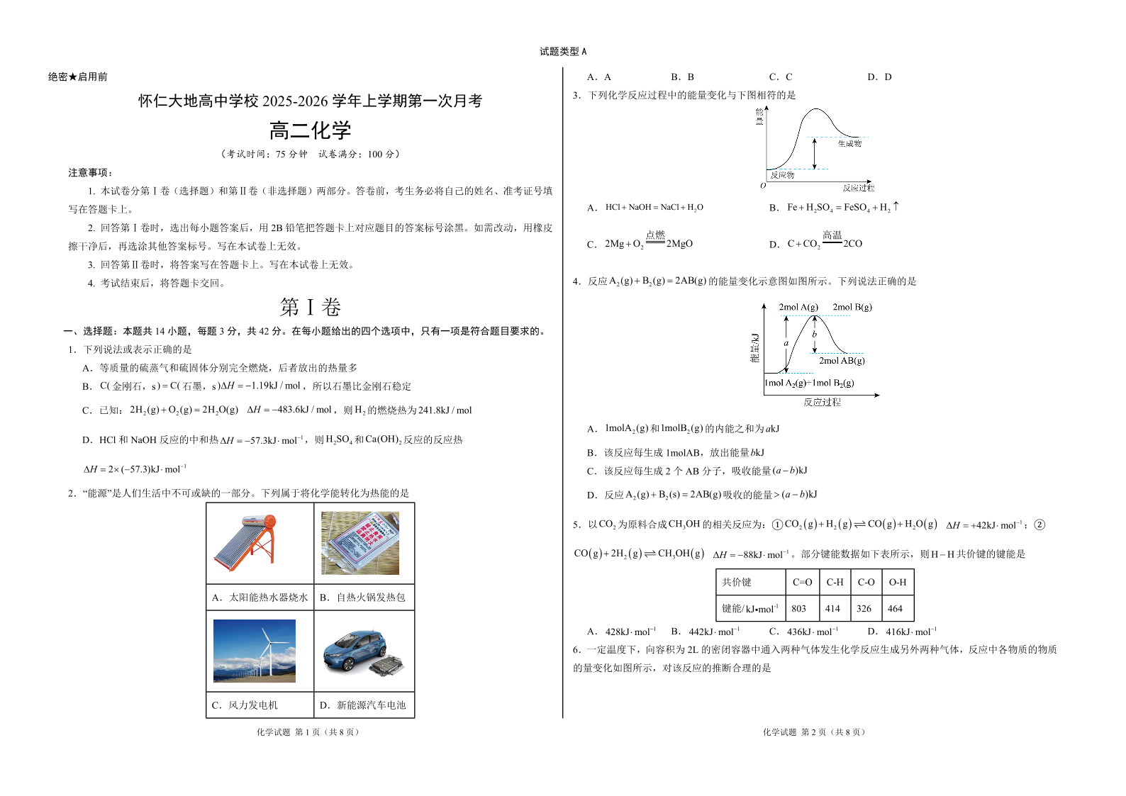 高二化学A卷--山西省朔州市怀仁市大地高中学校2025-2026学年高二上学期第一次月考