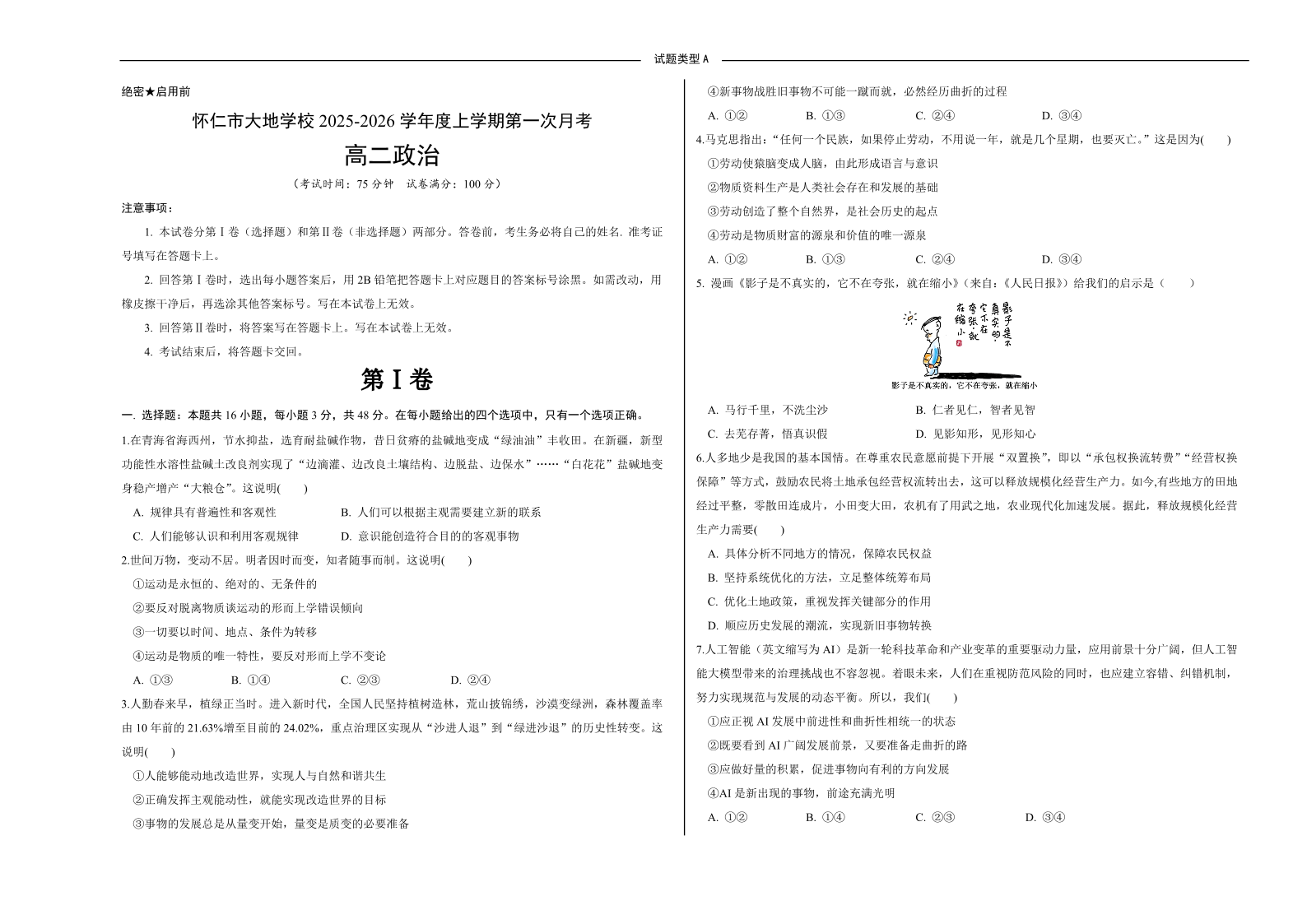 高二政治A卷--山西省朔州市怀仁市大地高中学校2025-2026学年高二上学期第一次月考