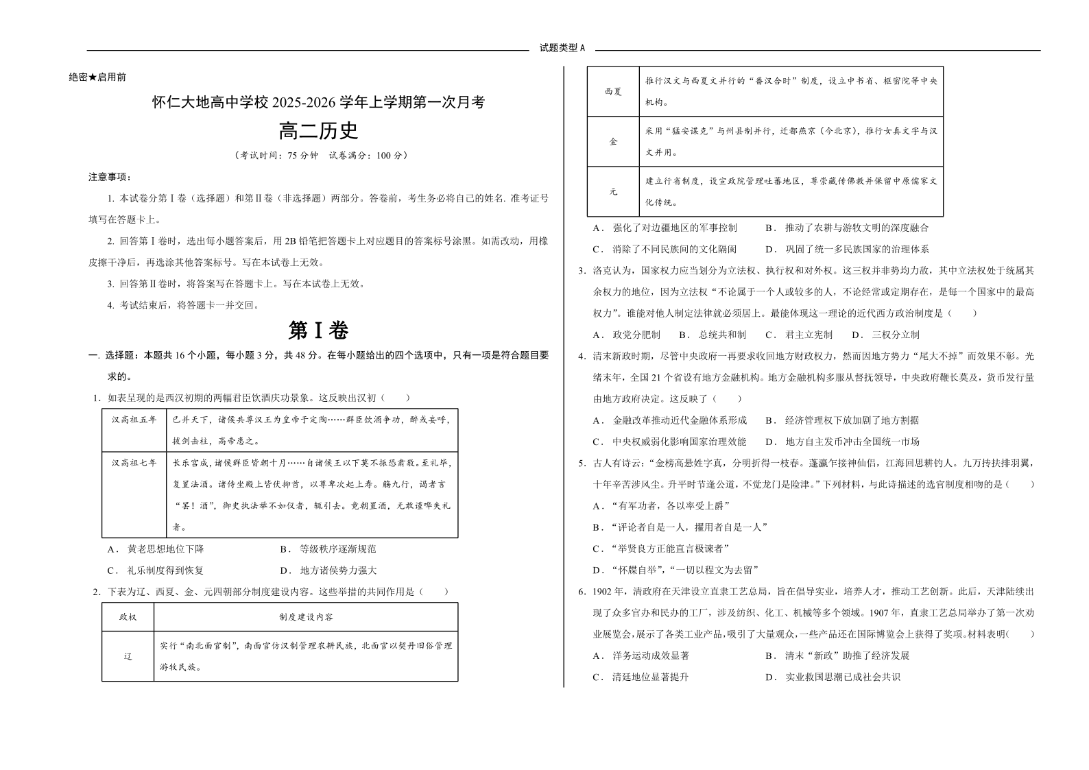高二历史A卷--山西省朔州市怀仁市大地高中学校2025-2026学年高二上学期第一次月考