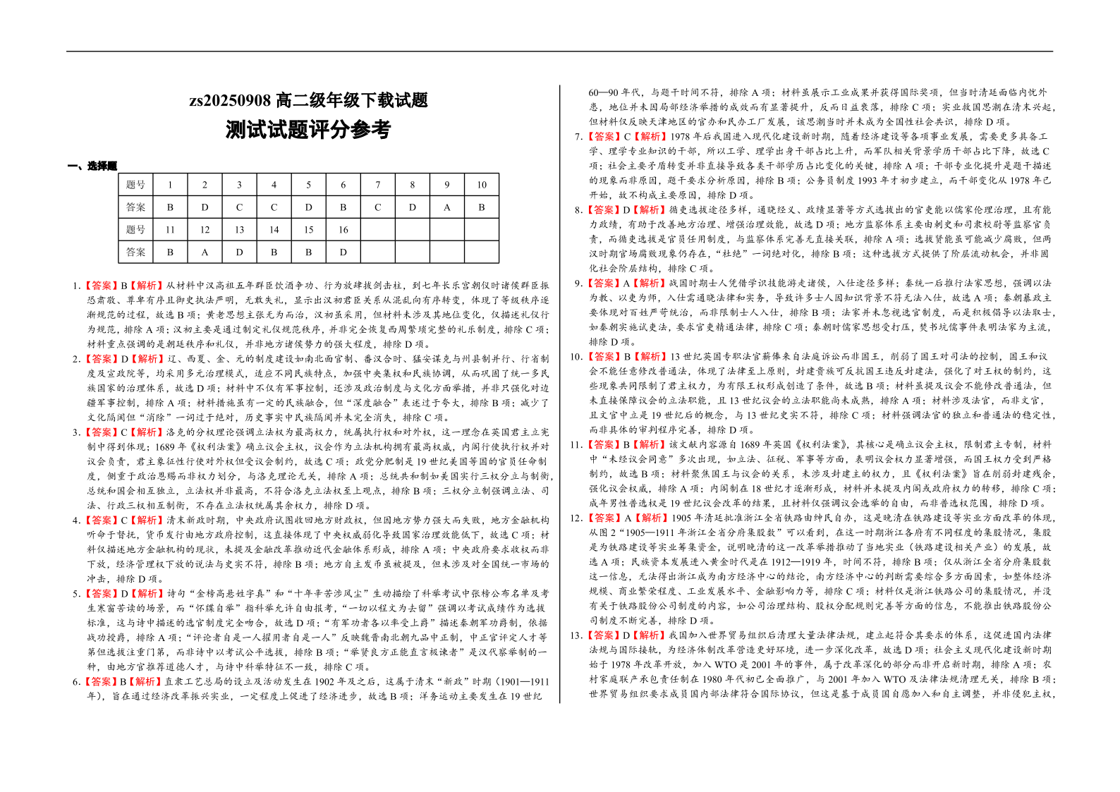 高二历史A卷答案--山西省朔州市怀仁市大地高中学校2025-2026学年高二上学期第一次月考