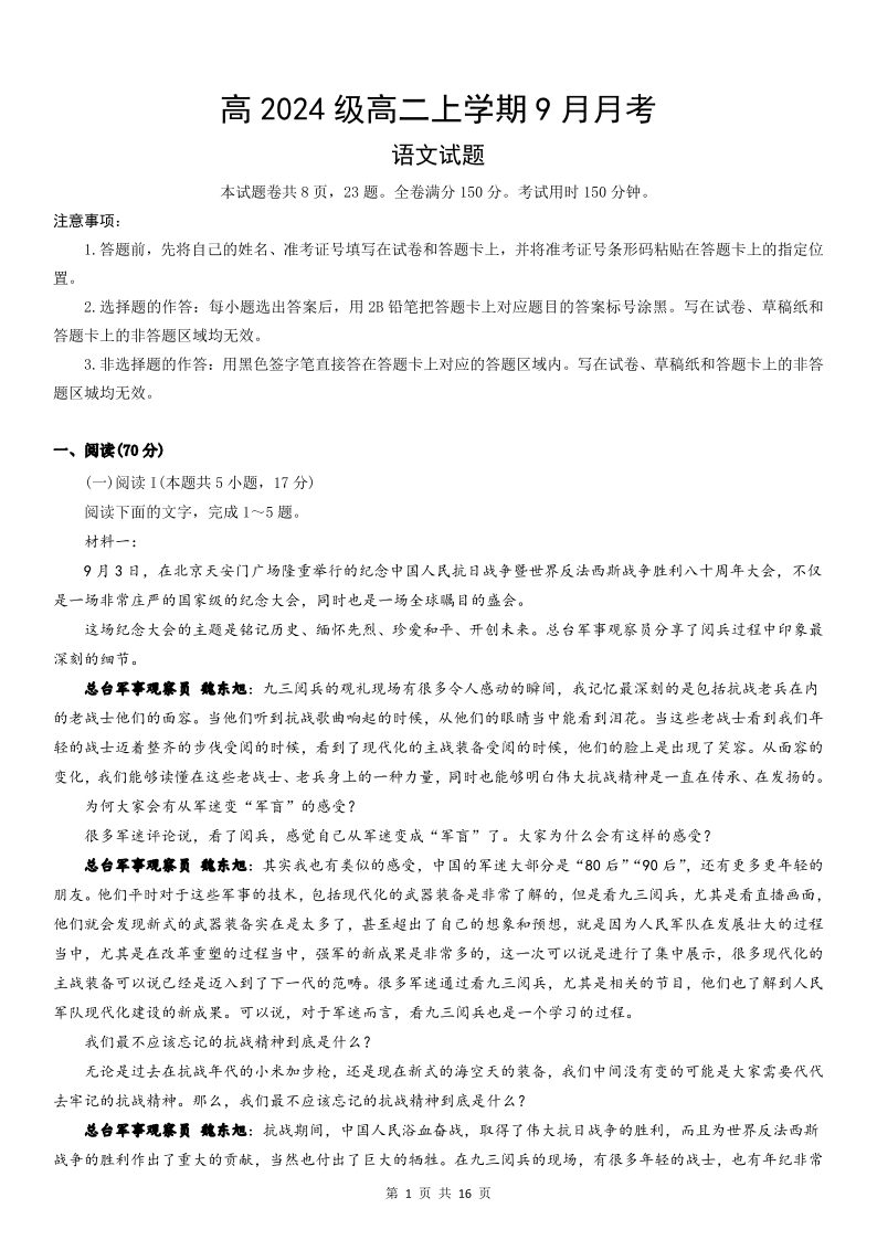 高二语文+答案--四川省达州市外国语学校2025-2026学年高二上学期9月月考