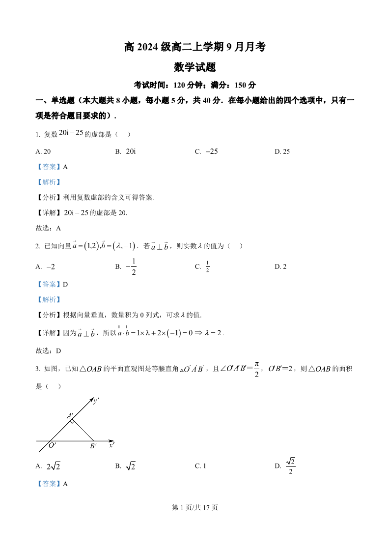高二数学(精品解析版)--四川省达州市外国语学校2025-2026学年高二上学期9月月考