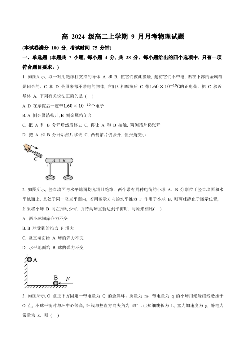 高二物理+答案--四川省达州市外国语学校2025-2026学年高二上学期9月月考