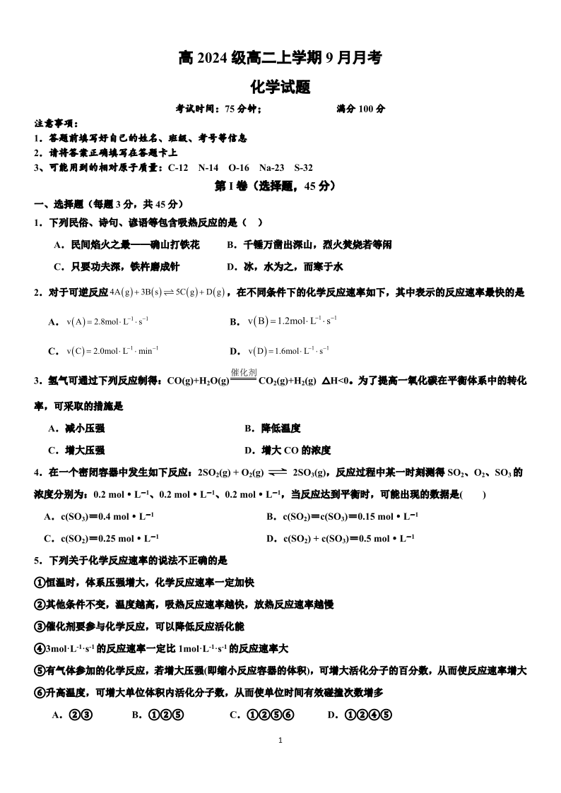 高二化学+答案--四川省达州市外国语学校2025-2026学年高二上学期9月月考