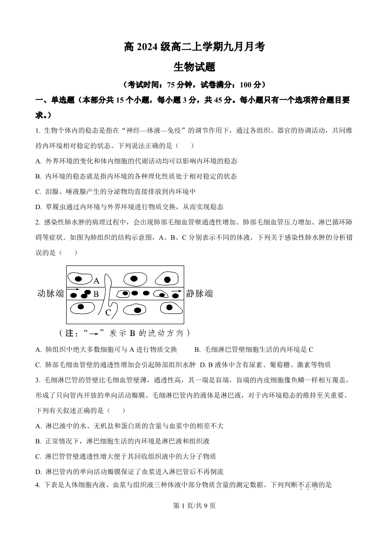 高二生物(原卷版)--四川省达州市外国语学校2025-2026学年高二上学期9月月考