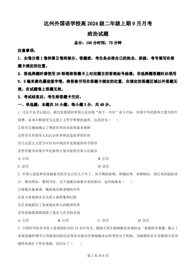 高二政治(原卷版)--四川省达州市外国语学校2025-2026学年高二上学期9月月考