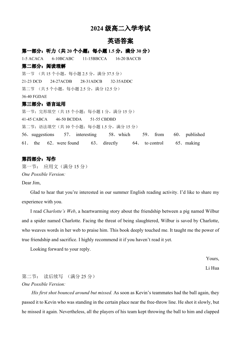 高二英语答案--四川省眉山市仁寿第一中学校(北校区)2025-2026学年高二上学期9月月考